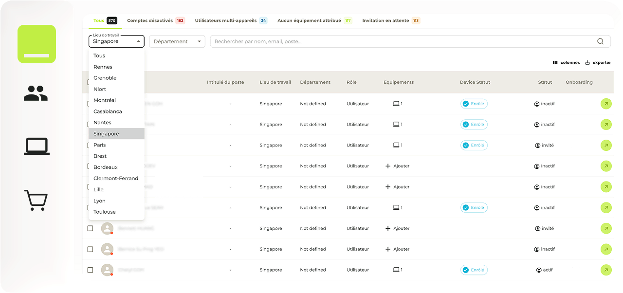 Gérer une flotte à l'international peut vite se révéler être un casse-tête. Chez Zenika, c'est un sujet maîtrisé. Via la plateforme, Pierre filtre simplement par "Entité : Singapour".