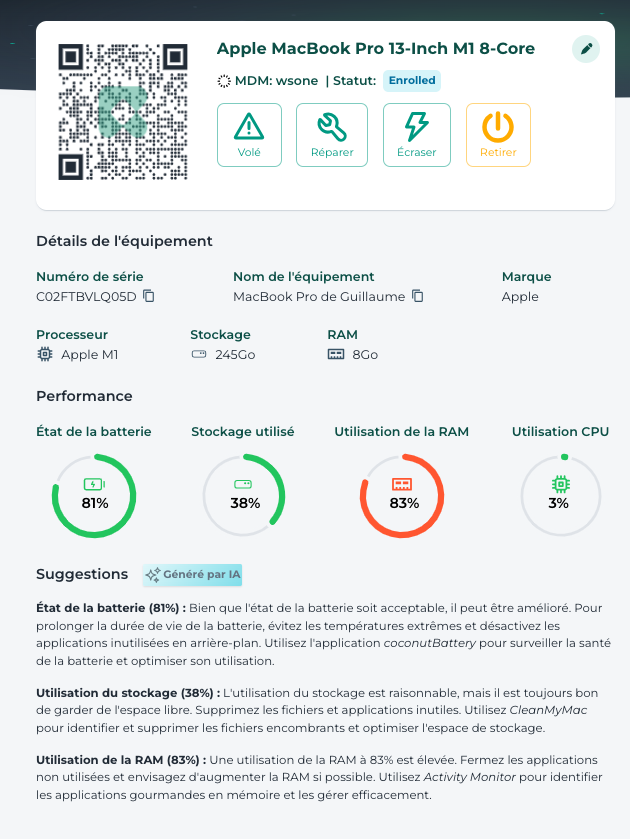 You can now also consult the recommendations formulated by an artificial intelligence that advises you according to the data provided by the telemetry agent. These recommendations are visible below the performance indicators.